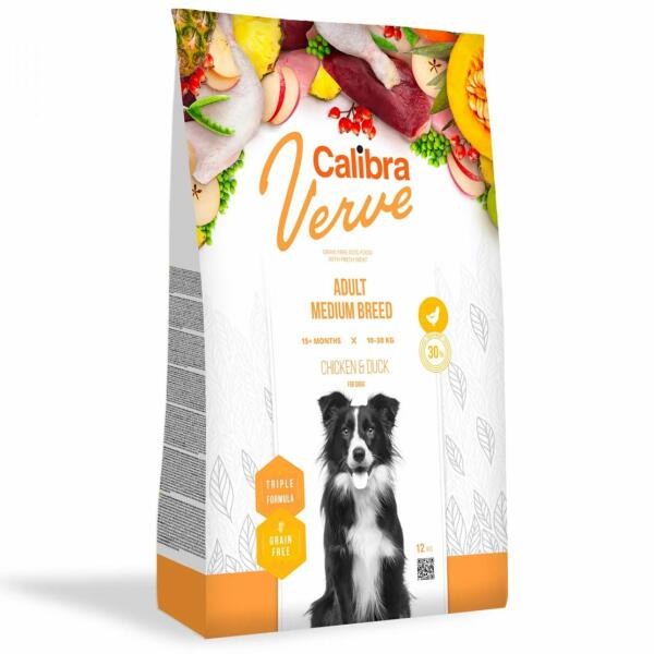 Gyártó: Calibra Modell: Dog Verve GF Adult Medium Chicken & Duck 12 kg Leírás: 75/25 arány, 75 % állati eredetű 30 % friss csirke Ananász – természetes immunrendszer erősítő C-Vitamin – immunrendszer erősítő / antioxidáns tulajdonságok Prebiotikumok (MOS, FOS, β-glükánok) – emésztés serkentő, immunrendszer erősítő Mojave jukka - széklet és puffadás csökkent