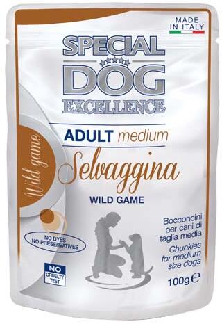 Minimum rendelhető mennyiség: 6 db Special Dog Excellence Adult Vad alutasakos nedves eledel . Monge Special Dog Olasz termékcsalád. Teljesértékű Monge Special Dog Excellence alutasakos Vad falatkák. - 1–8 éves korig közepes termetű felnőtt kutyák számára. -Ízletes, finom falatok -Nem tartalmaz színezékeket, tartósítószereket és hozzáadott cukrot Összetevők: Hús és sz