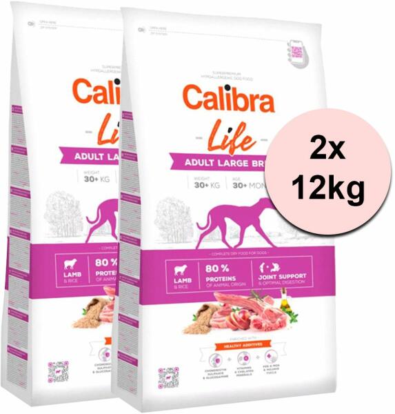 Calibra Life hipoallergén, teljes értékű, szuper prémium minőségű szárazeledel felnőtt (30 hónapostól), nagytestű (30kg fölött) kutyák számára, bárányhússal és rizzsel készült. akár 80% állati eredetű fehérjét tartalmaz a tápszemcsék mérete a nagytestű kutyák fiziológiai szükségleteihez igazodik a hozzáadott kondroprotektív anyagok gondoskodnak az ízületi p