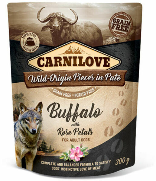 A Carnilove Dog Adult tasakos Paté egy gabona- és burgonyamentes teljes értékű eledel felnőtt kutyák számára bivallyal és rózsaszirommal. A Carnilove kutyák számára készült ízletes eledel természetes összetevők figyelembe vételével. Az eledelnek 85%- hústartalma. 59% pulyka és 26% bivalyhús. A pulykahús jól emészthető nyomelemekben (pl. : cink) és fehérjékben gazdag