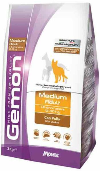A Gemon Dog Medium Adult 3kg Csirke egy ínycsiklandó csirkés száraztáp felnőtt kutyák számára. Kifejezetten közepes testméretű kutyák igényeihez igazított táp. - Kiválóan emészthető összetevők támogatják az állatok emésztését. - A csirkehús jól hasznosuló fehérjékben és aminosavakban dús szárnyashús. Természetes kondroitin-forrás, ami segíti az ízületek ru