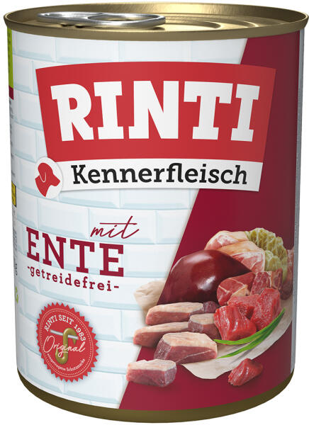 Rinti Dog Kennerfleisch kacsaszív konzerv 800g, Teljes értékű eledel felnőtt kutyák számára. finom húsdarabok. Teljes hús- és belsőségtartalom: 70%. adagolási utasítások: 5 kg-os kutyáknak 300 g, 10 kg-os kutyáknak 500 g naponta. összetevők: hús és állati eredetű termékek (15% kacsaszív, tüdő, máj, izom, bél, tőgy, bendő), ásványi anyagok, 0,2% lenmagolaj, 0,2% cu