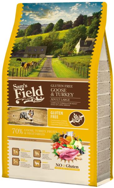 A Sam's Field Adult Large Gluten Free liba és pulyka egy teljesértékű állateledel nagytestű, felnőtt kutyák számára. Jellemzők :- gluténmentes- 70% liba, pulyka, gyümölcs és zöldség Összetétel :Szárított liba 26%, szárított pulyka 15%, burgonya 12%, rizs, baromfi zsír (kevert tokoferolokkal tartósítva, E-vitamin forrás), kicsontozott, friss pulyka 10%, zöldborsó 2,5%,