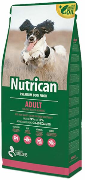 NutriCan Adult 3kg, KIVÁLÓ MINŐSÉGŰ CSIRKEHÚSSAL A TÖKÉLETES EMÉSZTHETŐSÉG ÉRDEKÉBEN FEHÉRJE 24% ZSÍR 13% METABOLIZÁLHATÓ ENERGIA 3.650 KCAL/KG ÖSSZETEVŐK: csirkeliszt (20%), szárított csirkehús (15%), kukorica, búza, csirkezsír (tokoferolokkal tartósítva), szárított alma (prebiotikumforrás), sörélesztő, hidrolizált csirkemáj (2%), heringolaj (1%), szárított ten