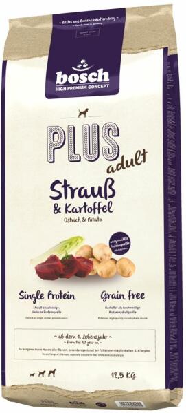 BOSCH Plus Adult Ostrich & Potatoes 12,5kg - Termékleírás A BOSCH Plus Adult gabonamentes eledel, amelyet 12 hónapos kortól, minden fajtájú kutyák számára fejlesztettek ki. Alapeleme a strucchúsból származó fehérje, amely egészséges és kiegyensúlyozott étrendet biztosít kutyájának. A szénhidrátok alternatív és egészséges forrása tehát a burgonya, amely nem terhel
