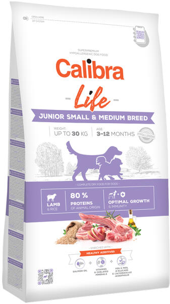 Calibra Life hipoallergén, teljes értékű, szuper prémium minőségű szárazeledel fiatal (3-12 hónapos), kis-és közepes testű (30 kg-ig) kutyák számára, bárányhússal és rizzsel készült. akár 80% állati eredetű fehérjét tartalmaz az eledel speciális összetétele a hozzáadott anyagok (lazacolaj, vitaminok, ásványi anyagok, prebiotikumok) segítségével hozzájárul a fi
