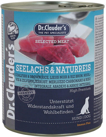Dr. Clauders Dog Selected Meat Coalfish&Brown Rice 800g Teljes értékű eledel felnőtt kutyák részére fekete tőkehallal és barna rizzsel. Összetétel: 31,5% fekete tőkehal, 27,5% sertés (máj, tüdő), 23% marha (tüdő, tőgy), 12,8% baromfi (sovány hús, belsőségek), 4% főtt barna rizs, 1% ásványi anyagok, 0,2% élesztő kivonat (béta-glükán). Analitikai összetevők: nyer