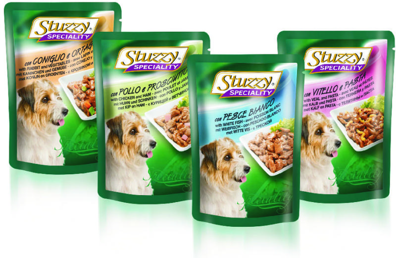 Teljes értékű táp kutyáknak borjúhús-darabokkal és tésztával - 100 g tasak. Összetétel: hús és hússzármazékok 45 % (ebből 10% borjúhús), gabonafélék (tészta 4%), növényi származékok, ásványi anyagok Analitikai összetevők: nyersfehérje 7%, nedvesség 82%, zsírok 4%, hamu 2%, rostok 0,3%