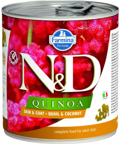 Teljes értékű diétás eledel felnőtt kutyák számára. N D Quinoa Bőr Szőrzet - Fürj Kókusz egy teljes értékű diétás eledel felnőtt kutyák számára valamely összetevővel vagy tápanyaggal szembeni érzékenység csökkentésére. Összetevők: fürjfilé és a comb (55%), quinoamag extrahált (5%), halolaj, kókusz (4%), frukto-oligoszacharidok, kondroitin-szulfát, glükozamin