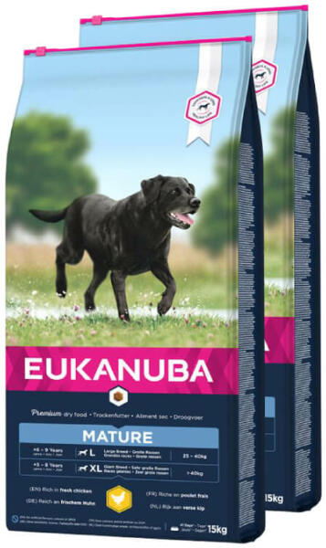 Eukanuba Thriving Mature Large Breed Kiegyensúlyozott száraz kutyatáp nagy termet: 6 éves, óriás méret: 5 éves kortól. Méretre szabott receptúra a hosszú és egészséges élet szolgálatában. Korábban: Mature & Senior Large Breed csirke. Az Eukanuba 10 éves megfigyelései azt mutatják, hogy a kutyák átlagon felüli magas életkort is elérhetnek: Hűséges társa rászolgál