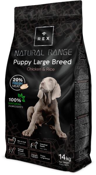 Rex Natural Range Puppy Large Breed csirke és rizs 14kg Teljes értékű eledel nagytestű kutyakölyköknek 2-12/18 hónapos korig. A HÁZ KIRÁLYAINAK Kifejezetten nagytestű fajtájú kölyökkutyák számára összeállított táp, segíti a csontok és szövetek fejlődését, hogy egészségesen és erősen nőjenek. Kondoprotektorokat tartalmaz az ízületek ápolására. Optimális növek