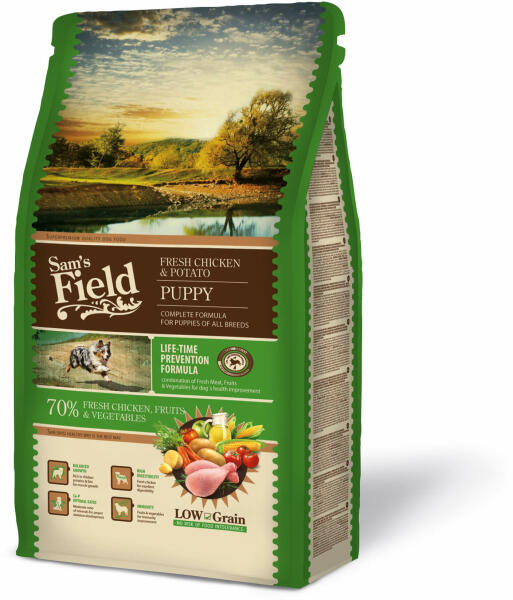 A Sam's Field Fresh Puppy csirke és burgonya egy teljesértékű állateledel, valamennyi fajtájú kölyök kutya számára. Jellemzők :- hús, gyümölcs és zöldség kombináció a kedvence minél jobb egészsége érdekében- alacsony gabonamag tartalom: nincs élelmiszer intolerancia veszély- 70% hús, gyümölcs és zöldség- komplett receptúra Összetétel :Csirkehús, csirkemáj, bur