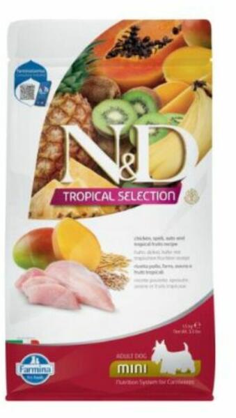 Az N&D Tropical Selection Dog Chicken Adult Mini 5kg gabonamentes prémium száraztáp kistestű felnőtt kutyáknak. Friss csirkehús és trópusi gyümölcsök kombinációjával támogatja az egészséges emésztést, az immunrendszert és a szőrzet fényességét, miközben különleges ízélményt kínál. Az N&D Tropical Selection Dog Chicken Adult Mini 5kg prémium minőségű, ga