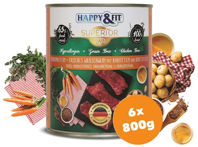 A Happy&Fit Superior Friss Vaddisznóhús S. répával, burgonyával további jellemzői: 65% friss vaddisznóhússal , mely természetes forrása minden olyan tápanyagnak, amelyre egy kutyának szüksége van. A sárgarépa és a burgonya magas rosttartalommal rendelkezik, megkönnyítve az emésztést. A lenmagolaj segítheti a fényes szőrzet és egészséges bőr fenntartását. Ez a ter