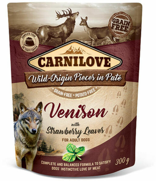 A Carnilove Dog Adult tasakos Paté egy gabona- és burgonyamentes teljes értékű eledel felnőtt kutyák számára szarvassal és eperlevéllel. A Carnilove kutyák számára készült ízletes eledel természetes összetevők figyelembe vételével. Az eledelnek 85%- hústartalma. 59% pulyka és 26% szarvas. A pulykahús jól emészthető nyomelemekben (pl. : cink) és fehérjékben gazdag. To