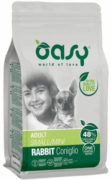 Oasy Dog OAP Adult Small/Mini Rabbit 2,5kg Teljes értékű eledel közepes és nagytestű felnőtt kutyák számára egy éves kortól. A 48% nyúlhúst, mint egyetlen állati fehérjét tartalmazó eledel ideális felnőtt kutyák számára, különösen azoknak, akik ételintoleranciában, bél- vagy bőrérzékenységben szenvednek. Összetétel: friss nyúlhús 30%, rizs, dehidratált nyúl 1