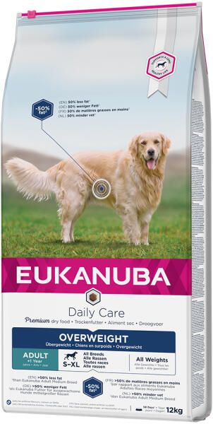 Eukanuba Daily Care Overweight & Sterilized Kutyatáp - 12 kg Kifejezetten túlsúlyos és ivartalanított kutyák számára készült száraz kutyatáp Az Eukanuba Daily Care Overweight & Sterilized kutyatáp 12 kg-os kiszerelése tökéletes választás azoknak a túlsúlyos vagy ivartalanított kutyáknak, akiknek segítségre van szükségük a súlyuk szabályozásában és az egészs