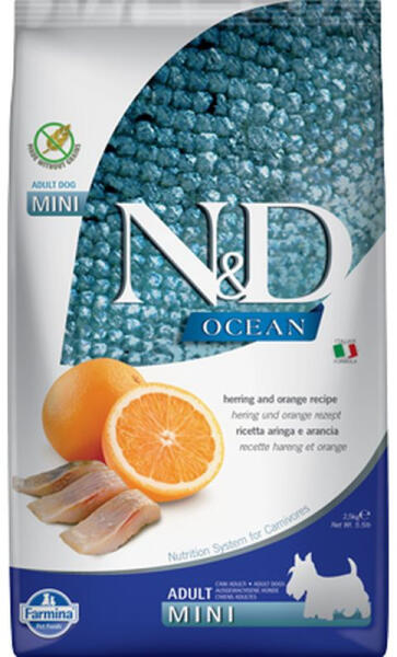 Teljes értékű gabonamentes eledel mini és kistestű felnőtt kutyáknak. Összetétel: friss hering (26%), szárított hering (25%), burgonya, halolaj, szárított egész tojás, borsó növényi rostja, szárított répa, szárított lucerna, inulin, fruktooligoszacharidok, mannán-oligoszacharidok, szárított édes narancs (0,5%), gránátalma por, szárított alma, spenót por, psyllium (
