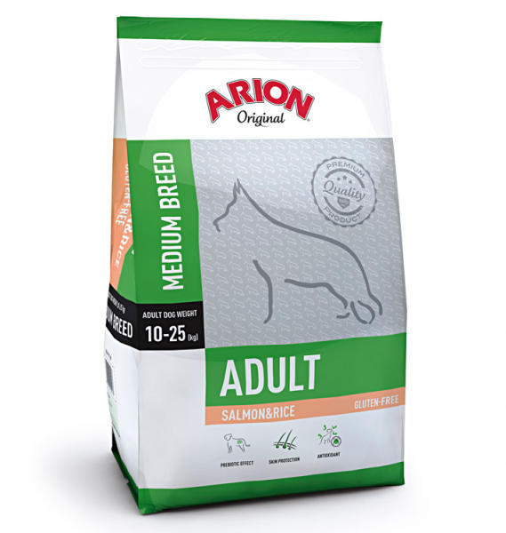 Arion Original Adult Medium Salmon&Rice gluténmentes, teljesértékű szárazeledel kifejlett kutyák számára. Összetétele pozitívan befolyásolja a bőr és szőrzet alakulását, ezzel hozzájárul az életminőség jelentős javulásához, különösen az érzékeny és száraz bőrű, allergiás reakciókra hajlamos kutyák esetében. Az Arion Original prémium minőségű, gluténme