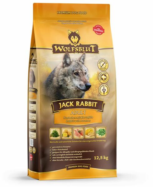 Kiszerelés: 12,5kg Wolfsblut Jack Rabbit Adult - Nyúl zöldségekkel A nyúl különösen gazdag fehérjében, nagyon alacsony zsírtartalmú, kevés koleszterint tartalmaz, gazdag telítetlen zsírsavakban és rengeteg E- és B-vitamint tartalmaz. Természetes vitaminok a bogyókeveréken keresztül. Gabonamentes. Értékes superfoodokkal, mint például szeder, bodza, aróniabogyó, valamint g