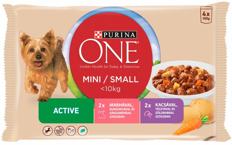 Purina ONE MINI/SMALL Active Marhával és kacsával szószban nedves kutyaeledel 4x100g Marhával és kacsával 2 X Marhával, burgonyával és sárgarépával szószban. Összetétel: Hús és állati származékok (melyből marha 4%), Növényi fehérjekivonatok, Hal és halszármazékok, Növényi eredetű származékok, Zöldségek (0,8% dehidratált burgonya, egyenértékű 7,2% burgonyával