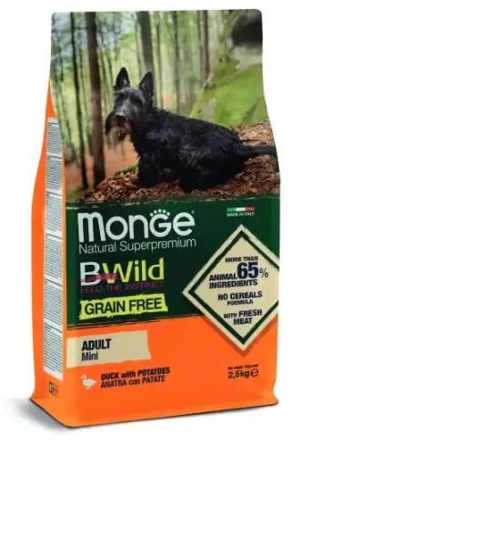 Monge BWild Grain Free Dog Adult - Mini Duck, PotatoTeljes értékű és kiegyensúlyozott, gabonamentes szárazeledel felnőtt kutyák számára kacsával és burgonyával. Az olyan válogatott, nem gabonából származó szénhidrátforrásoknak köszönhetően, mint a burgonya és a lencse, támogatja kutyája egészségét. Mangán-oligoszacharidokkal (M. O. S. ) és Xylo-oligoszacharidokkal (