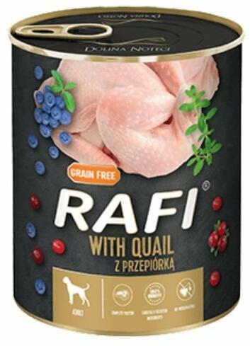Dolina Noteci Rafi fürjjel 800g - Leírás Teljes értékű nedves eledel minden fajta felnőtt kutyának - fürjjel. A Rafi nedves eledelt fürjjel a magas fehérjetartalma és gazdag aminosav-összetétele (fenilalanin és cisztin) különbözteti meg. A fürjből származó hús és nyersanyagok, különösen a zsírja, értékes n-6 többszörösen telítetlen zsírsavak forrása, amelyek sz