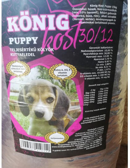 Húsok, hús-származékok, (min. 10% baromfi), feltárt gabonák(kukorica, búza, rizs), állati zsiradék(baromfi, sertés), ásványi anyagok és vitaminokat tartalmazó premix. Garantált beltartalom : Nedvességtartalom: 10% Nyersfehérje min. : 30% Nyerszsír max. : 12% Nyersrost: 2,70% Nyershamu: 9,40% Ca min. : 2,80% Na min. : 0,31% P min. : 1,97% A-vit. min. : 10.000NE/kg D3-vit. min. 1.2