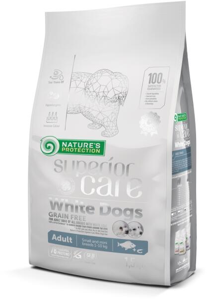 Nature's Protection Superior Care White Dogs GF White Fish Adult Small 1,5kg - Termékleírás Teljes értékű gabonamentes szárazeledel fehér hallal 1-10 kg-os fajtájú, fehér színű felnőtt kutyáknak. 10 hónapos kortól. Egyedülálló formula felnőtt kutyák számára, amely segít megelőzni a szőrzet elszíneződését okozó rozsdafoltokat a szem, a mancsok és a pofa körül. Az