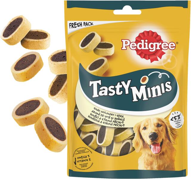 A PEDIGREE® Tasty Minis húsos, marhahús és sajt ízű darabkák formájában készült finomságok. Ez a kiegészítő eledel vitaminokban, ásványi anyagokban és Omega-3 zsírsavakban gazdag. A PEDIGREE® Tasty Minis nem csak szórakozást nyújt kedvencének, hanem mindennapi jutalomfalatnak is alkalmas tréning vagy játék közben. A jutalomfalat rágása és harapdálása lehetővé te