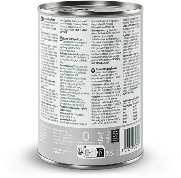 Összetétel: hús (35% friss bárányhús, 20% friss szarvashús, 15,1% szárított bárányhús, 3% báránymáj), 36,3% rizs, 9% teljes kiőrlésű rizs, répapép, lenmag, baromfizsír, sörélesztő, burgonya, 2,2% alma, lucerna, 1% fekete ribizli, hidegen sajtolt norvég lazacolaj (tokoferolkezelt), 1% gyógynövénykomplex (0, 23% csalán- és citromfű, pitypanglevél, kamilla és hársfav