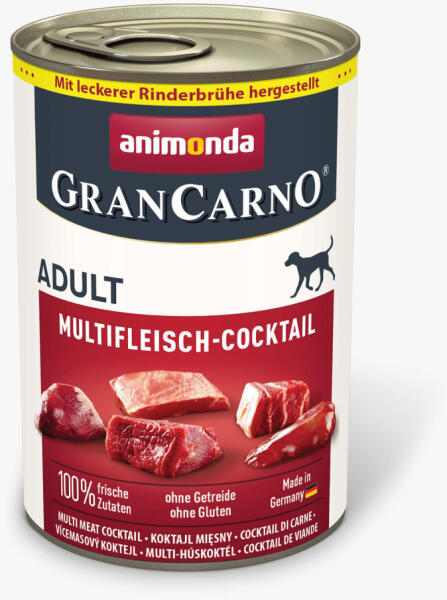 Ízletes, húsos összetevők színes koktélja: 100%-ban friss, húsos marha-, csirke-, pulyka- és vadhús-összetevők egyesülnek a GranCarno Adult Multi-Meat Cocktailben . Hamisítatlan élvezet, amelyben a négylábú barát az utolsó falatig kiüríti a kutyatálat. Összetétel: 38% marhahús (tüdő, hús, máj, vese, tőgy, szív), 29% marhahúsleves, 18% csirke (szív, nyak, gyomor), 6