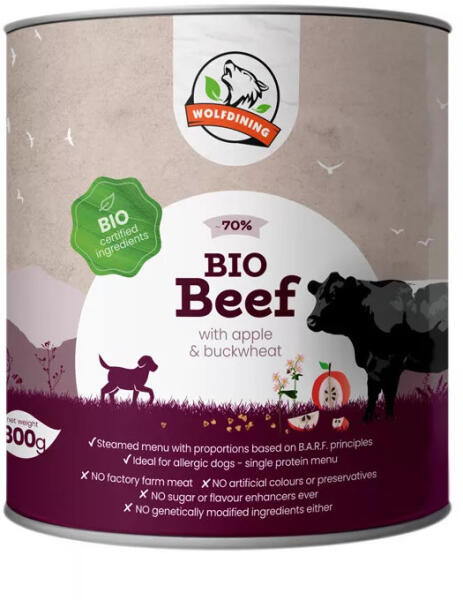 70% BIO MARHAHÚS OS párolt menü bio almával és bio hajdinával gazdagítva, bio lenmagolajjal. Kizárólag friss hús, bio zöldség és gyümölcs feldolgozásával , amelyeket kontrollált, alacsony hőmérsékleten párolnak készre az értékes tápanyagok és az ízek megőrzéséért. Teljes értékű menü felnőtt kutyáknak. A kutyák ragadozó emésztőrendszere legkönnyebben a hú