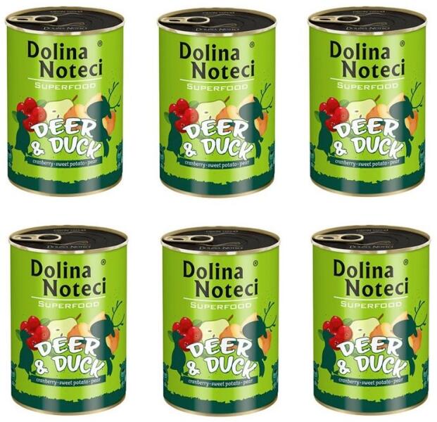 A Dolina Noteci Superfood nedves kutyaeledel 80%-ban tartalmaz húst és állati eredetű termékeket (40% szarvas, 40% kacsa). A készítmény friss gyümölcsöket és természetes adalékanyagokat is tartalmaz, amelyek rendkívül magas biológiai hatóanyag-tartalommal rendelkeznek – pozitívan hatnak a kutya szervezetére, mint például az új-zélandi kagyló vagy a tengeri moszat. A diet
