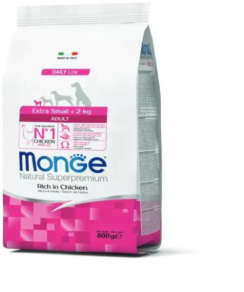 Monge Dog Daily Line Extra Small AdultTeljes értékű szárazeledel 2 kg-nál kisebb, felnőtt kutyák számára csirkével. A kiváló minőségű alapanyagoknak és az olasz kutatómunkának köszönhetően egészséges táplálkozást biztosít kutyájának. A termék fő összetevője a csirke, amely könnyen emészthető és a friss hús hozzáadásának köszönhetően nagyon ízletes. A re