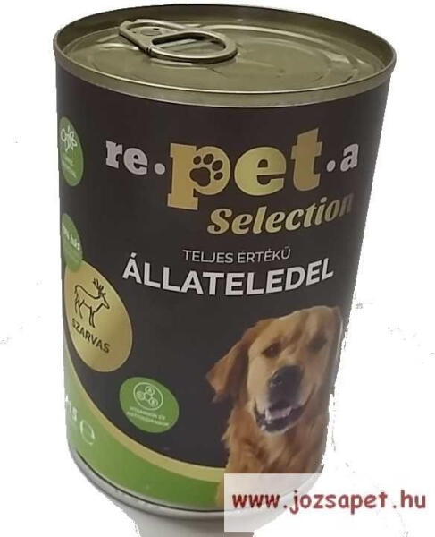 Repeta Selection Kutyakonzerv Szarvas-Csipkebogyó 1240g Igazi ínyencség a kutyának, szarvassal és csipkebogyóval. Teljes értékű kutyakonzerv, magas fehérjetartalommal. A Repeta Selection szarvasos konzerv kutyáknak csipkebogyóval egy prémium minőségű, teljes értékű konzerves eledel, felnőtt kutyák részére. Jellemzők : - Értékes gyümölcstartalma biztosítja a vitaminok t