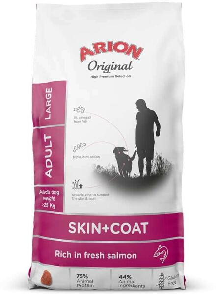 Az Arion Original Skin & Coat Adult Large egy teljes értékű eledel nagytestű, felnőtt kutyák számára, friss lazaccal. Gluténmentes, monoprotein, halalapú receptúrája tengeri összetevők egyedülálló keverékét és szerves cinket tartalmaz a bőr és a szőrzet egészségéért, valamint az ízületek támogatásáért csontprotektorok keverékét. ÖSSZETÉTEL: Hal (32%, ebből