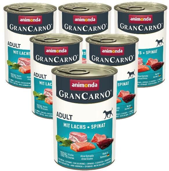 Az Animonda GranCarno Adult Dog Salmon and Spinach egy teljes értékű nedves eledel lazaccal és spenóttal felnőtt kutyák számára. Az Animonda GranCarno kutyáknak kifejezetten a legmagasabb minőségű friss húsokból lett összeállítva. Az eledel fontos és könnyen emészthető tápanyagokban gazdag. A GranCarno nem tartalmaz gabonaféléket, szóját, semmilyen mesterséges színezé