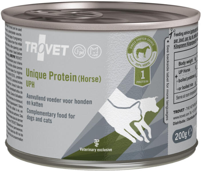 Egyféle fehérje forrást tartalmazó hipoallergén diétás táp kutyák és macskák részére, 100% lóhúsból táplálék allergia és intolerancia esetén. Kölyköknek is adható. A TROVET UNIQUE PROTEIN konzervek kizárólag egyféle fehérjeforrást tartalmazó hipoallergén diétás tápok, melyek mellé tetszés szerint adható a szénhidrát összetevő. Eliminációs diéta esetén e