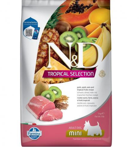 N&D Tropical Selection Dog Pork Adult Mini 5kg Teljes értékű eledel kistestű felnőtt kutyák részére Sertééshússal , alacsony glikémiás indexű ősi gabonafélékkel és Trópusi gyümölcsökkel (papaya, a mangó, az ananász, a banán és a kiwi ). A TRÓPUSI GYÜMÖLCSÖKBŐL VITAMINOK SOKASÁGA A KEDVENC ÉTELÉBEN! Az alacsony glikémiás indexű ősi gabonafélék, amelyek el