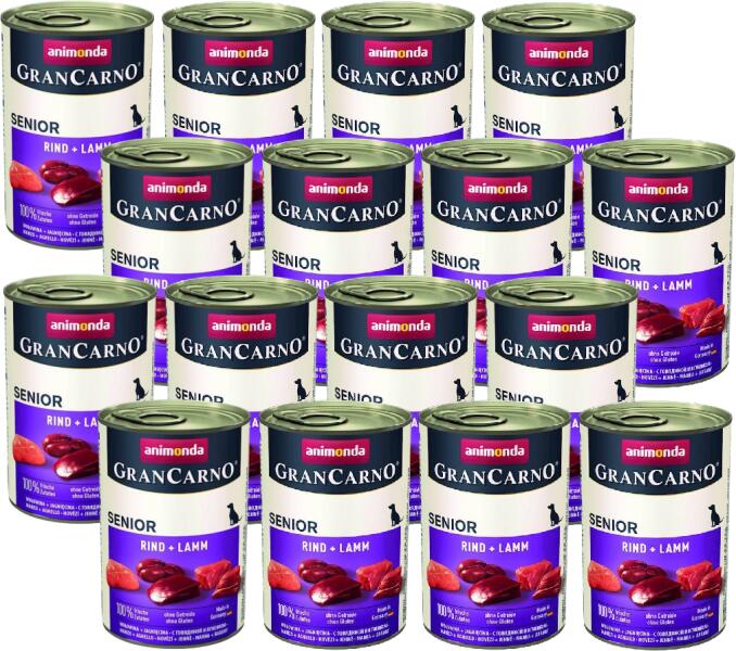 Animonda GranCarno Senior Marha és Bárány 400g - Termékleírás Az Animonda GranCarno Senior teljes értékű nedves eledel marhahússal és bárányhússal minden fajta idősebb kutyának. Az Animonda GranCarno kutyák számára kifejezetten a legmagasabb minőségű friss húsból készült. Az étel fontos és könnyen emészthető tápanyagokban gazdag. A GranCarno nem tartalmaz gabonafél