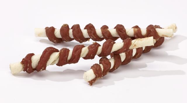 A marhahúsba csomagolt marhabőr pálca ízletes és könnyen emészthető rágcsálnivaló. Tökéletes játékhoz és jutalomként is használható. Kielégíti a rágás és harapás iránti igényt, valamint segít tisztán tartani a szájat. Ideális kisebb fajták számára. Összetétel : hús és állati termékek 89,9% (beleértve a marhahúst 79,9%), mogyorófehérje, glicerin, burgonya