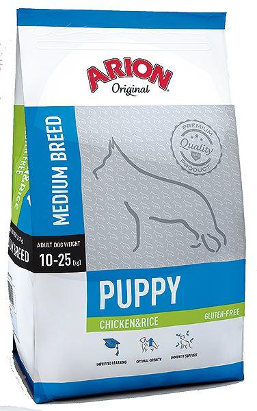 Arion Original Puppy Medium Chicken&Rice gluténmentes, teljesértékű szárazeledel a közepes testű fajták kölykeinek, az optimális fejlődés érdekében. Felnőtt kutya súlya 10-25kg. Az Arion Original prémium minőségű, gluténmentes kutyaeledel, mely a megbízható alapanyagoknak köszönhetően kiegyensúlyozott táplálék kedvencének, és csökkenti az allergén anyagok tel