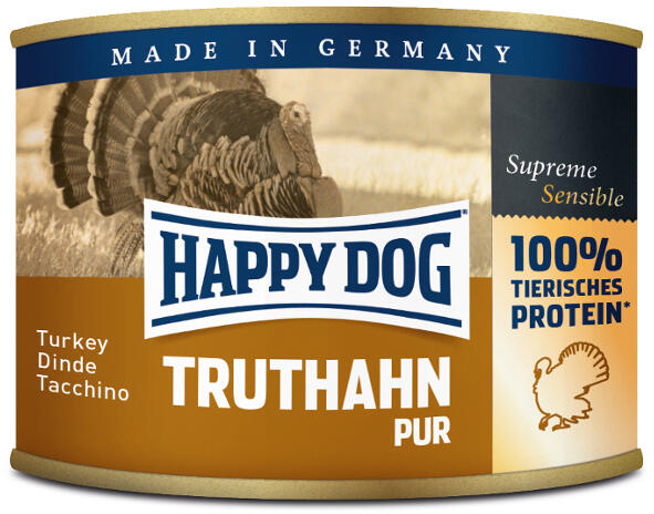 A Happy Dog Tiszta pulyka házi, kizárólag friss vágású pulykából készül, szója, növényi adalékok, valamint színezék és tartósítószerek hozzáadása nélkül! A tiszta pulyka csak egyetlen proteinforrást tartalmaz és ezért különösen alkalmas ételérzékenység és allergia esetén történő táplálásra. Ideális a Happy Dog pelyhekhez történő keverésre! Összetéte