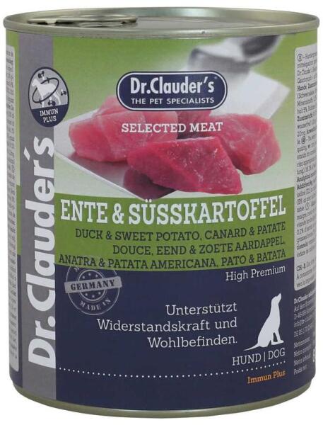 32381000 EAN kód: 4014355323819 Dr. Clauders Dog Selected Meat Duck&Sweet Potato 800g Teljes értékű eledel felnőtt kutyák részére kacsahússal és édesburgonyával. Összetétel: 41,5% kacsahús, 36% sertés (máj, tüdő), 16,3% marha (tüdő, tőgy), 5% édesburgonya, 1% ásványi anyagok, 0,2% élesztő kivonat (béta-glükán). Analitikai összetevők: nyersfehérje 10%, nyerszsí