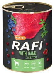 Teljes értékű konzerv minden fajta felnőtt kutyának - vadhússal Össze tevők: hús és állati eredetű termékek 65% (vadhús 4%), gyümölcs (áfonya 2%, áfonya 2%), ásványi anyagok, olajok és zsírok (lenmagolaj 0,2%), szárított kakukkfű 0,01%. Analitikai komponensek: nyersfehérje - 9%, nyerszsír - 7%, nyershamu - 2,5%, nyersrost - 0,8%, nedvesség - 78%, kalcium - 0,3%, foszfor