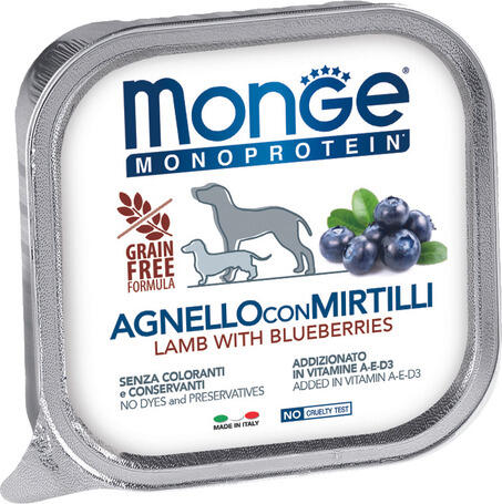 7.2kg Monge Grain Free Monoprotein Lamb & Blueberries Paté teljes értékű hipoallerán nedvestáp felnőtt kutyák számára alutálkában. Kizárólag magas minőségű, bárányhúsból származó fehérjét, valamint áfonyát tartalmaz. Az áfonyának köszönhetően magas ásványi anyag és vitamin tartalommal rendelkezik. Nagyon ízletes, 100%-ban olasz termék. Kiegyensúlyozott tá