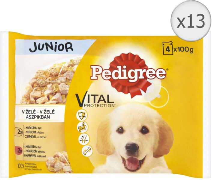 Pedigree Junior 4-pack alutasakos nedves kutyaledel csirkével marhával és rizsel 52x100g A Pedigree-nél hiszünk abban, hogy a kutyák jót tesznek velünk. Csodálatos ártatlanságukkal minden nap előcsalogatják a bennünk rejlő jót. A Pedigree az ízletes és egészséges kutyaeledelek és jutalomfalatkák teljes kínálatát nyújtja, amely mindent megad a kutyáknak, biztosítva a kit