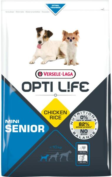 Az Opti Life Senior Mini minden szükséges tápanyagot biztosít a kutya számára 7 éves kor felett. Összetétel: csirke ( 32% szárított ), rizs, cirok, állati zsír, növényi rostok, lenmag, lazacolaj, sörélesztő, ásványi anyagok, szárított egész tojás, FOS, MOS, licitin, tengeri alga, szőlőmag, rozmaring, körömvirág, zöld tea. -70%-ban állati eredetű fehérjét tartalmaz