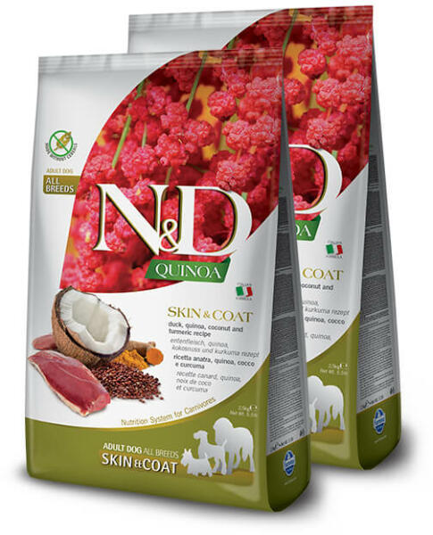 BŐR ÉS SZŐRZET, KACSÁVAL SKIN & COAT - Kacsa, quinoa, kókusz és kurkuma. Teljes értékű, gabonamentes eledel felnőtt kutyák részére. Az N&D Quinoa Skin&Coat egy teljes értékű diétás eledel kutyák számára, valamely összetevővel vagy tápanyaggal szembeni érzékenység csökkentésére. Használati utasítás: Adagolja az eledelt a táblázatban feltüntetett napi